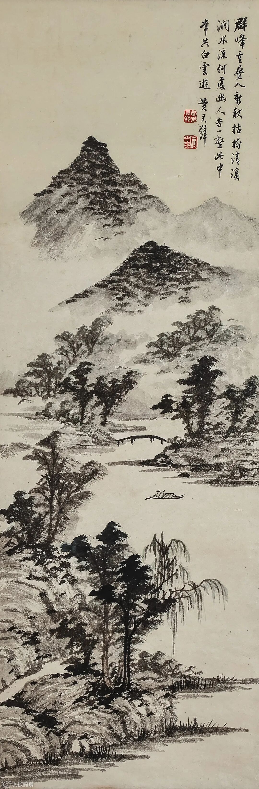 款识:群峰重叠入新秋,枯树清溪涧水流。何处幽人专一壑,此中常共白云游。黄君璧。