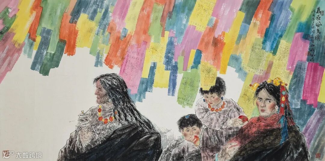 款识:高原风马旗。戊寅年春月,忆写西藏风情。
