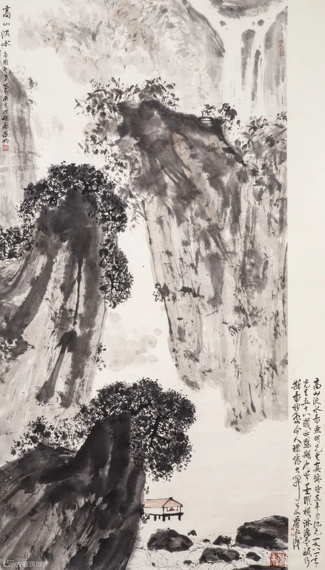 边跋:高山流水图。亚明先生真迹,时在辛酉纪元一九八一年,先生五十八岁正盛期也,笔墨纵横,淋漓尽致,乃斯图妙处,令人襟怀大开。戈父萧平识。