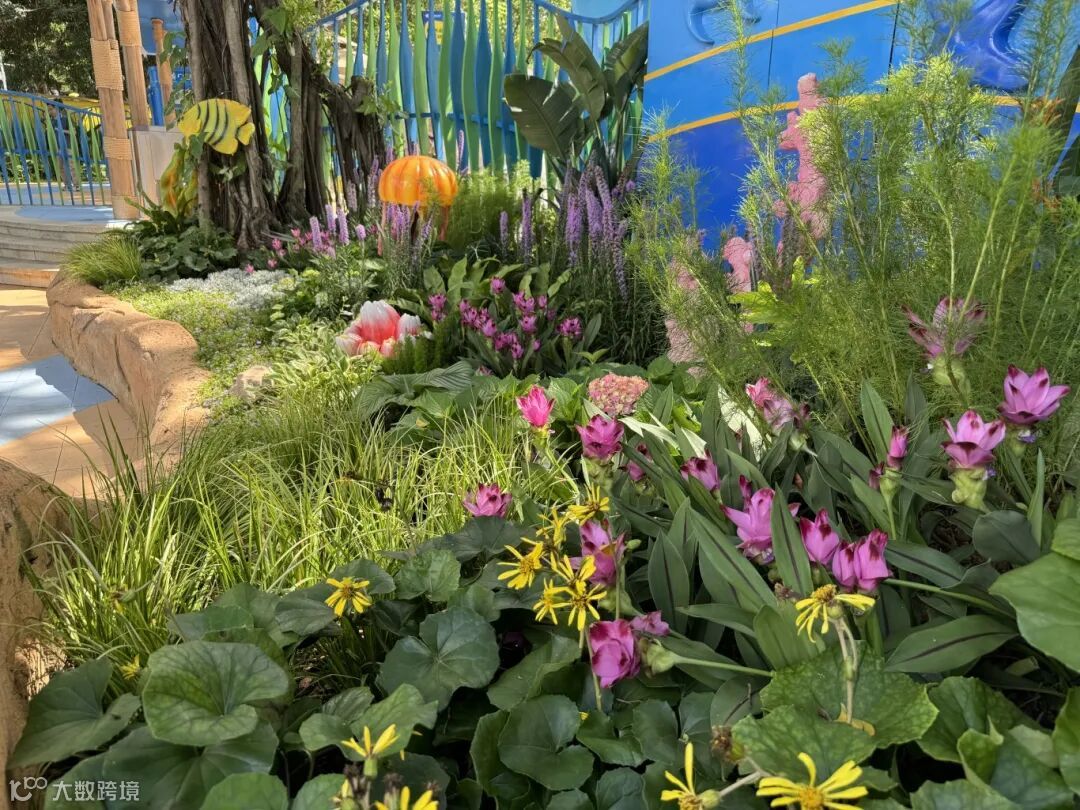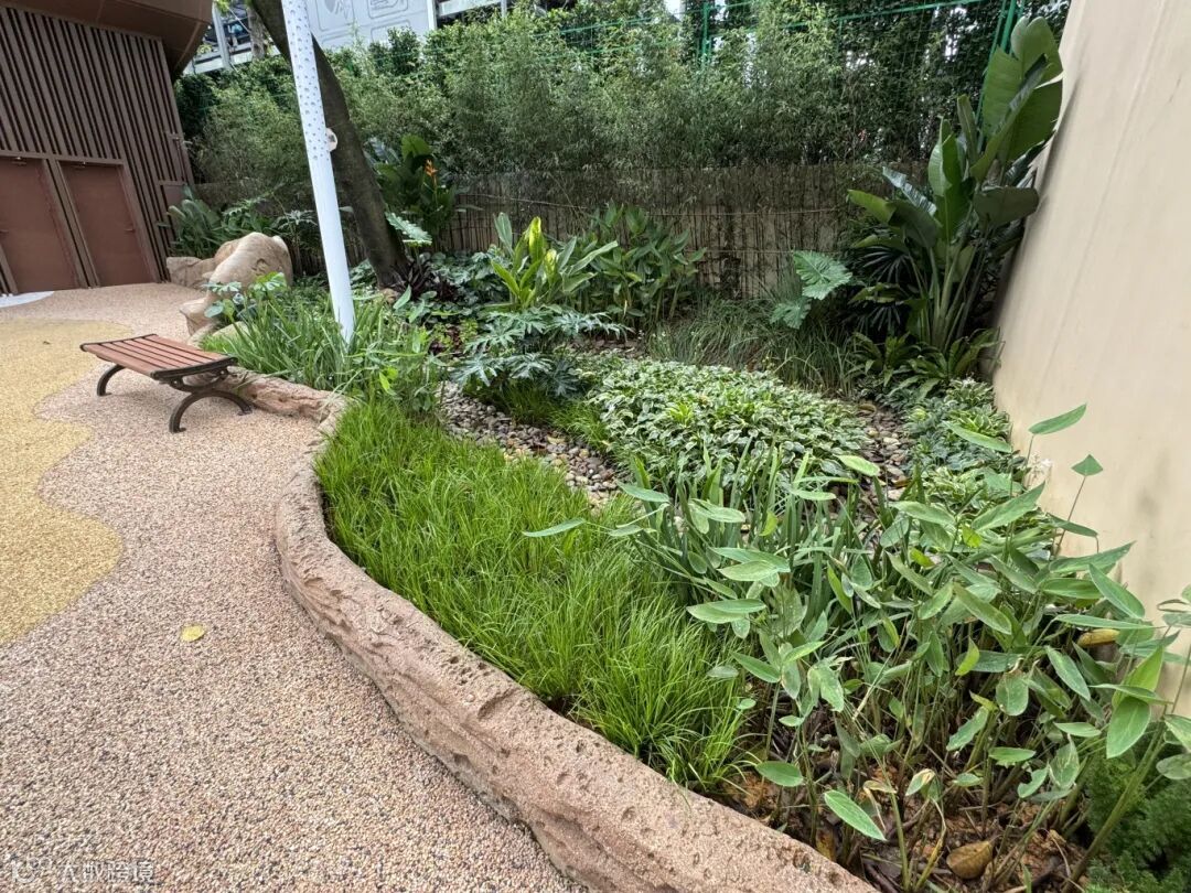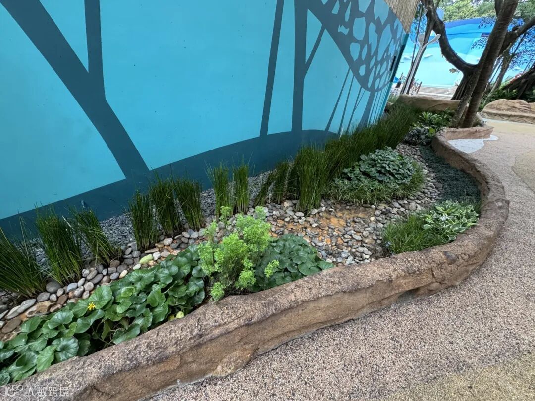 既要一步一景给游客带来美的感受,又要打造绿色生态环境,同时馆景融合。建广公司在海洋馆的绿化改造部分引入了海绵城市的设计理念,采用了雨水花园和下沉式绿地两项绿化措施,打造热带雨林风格。雨水花园在改造中得到了广泛应用,通过种植各种适应热带雨林气候的本地植物,如再力花、水生美人蕉、鸢尾和赤箭莎等多种水生植物,有效地截留和净化雨水,还起到了减缓地表径流、减少洪涝风险的作用。下沉式绿地主要分布在入口广场和雨林广场等公共低洼区域,种植了大量热带雨林植物的同时结合鹅卵石等铺装,提供绿色休憩空间,在增强了雨水管理能力的同时,也为游客提供了赏心悦目的美感