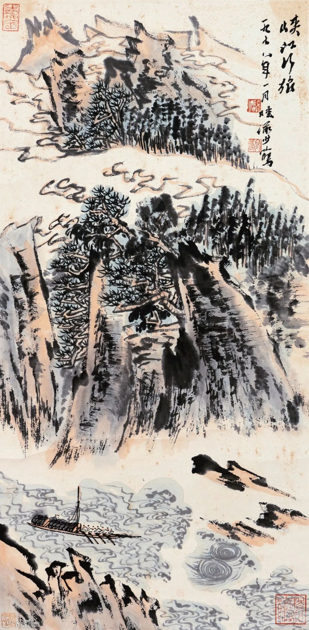 款识:1.两岸猿声啼不住,轻舟已过万重山。乙未孟夏,贺天健制。2.式诏仁契属,钱䍐。