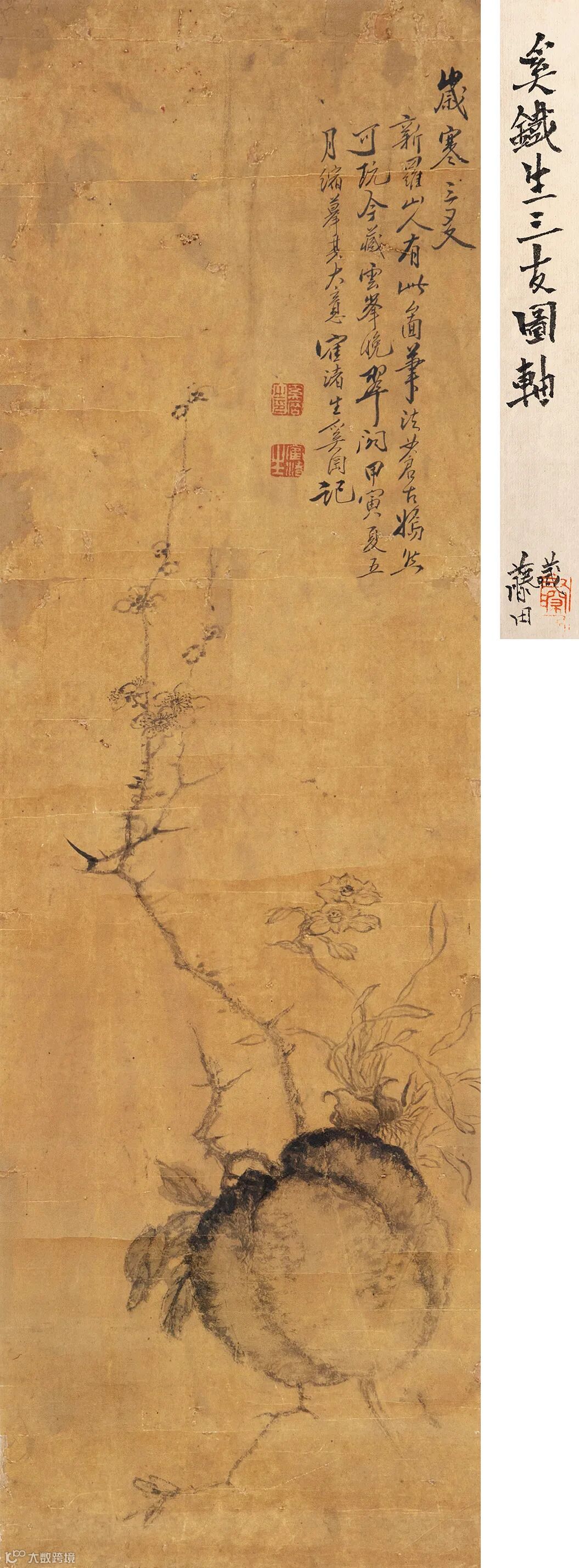 款识:新罗山人有此图,笔法苍古,嫣然可玩。今藏云峰晚翠阁,甲寅夏五月缩摹其大意,鹤渚生奚冈记。