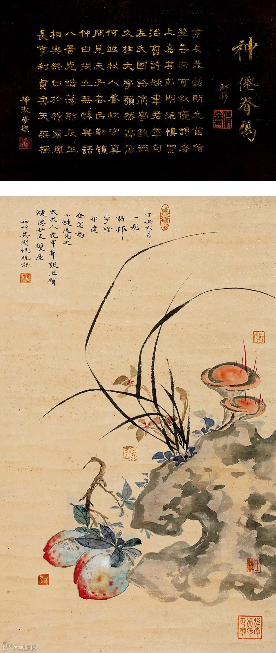 款识:丁丑六月,一飞、梅村、季铨、邦达合写,为小蜨道兄之太夫人花甲华诞,并贺蜨仙世丈双庆。世姪吴湖帆祝记。