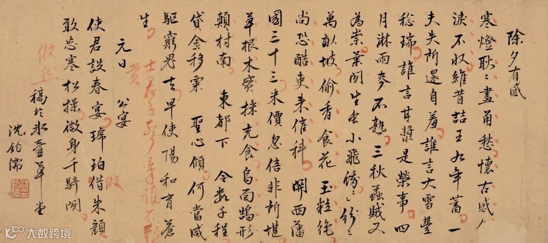 款识:元日公宴,使君设春宴,琥珀借朱颜。敢忘寒松操。微身千骑闲。稿于冰壶草堂,沈钧儒。
