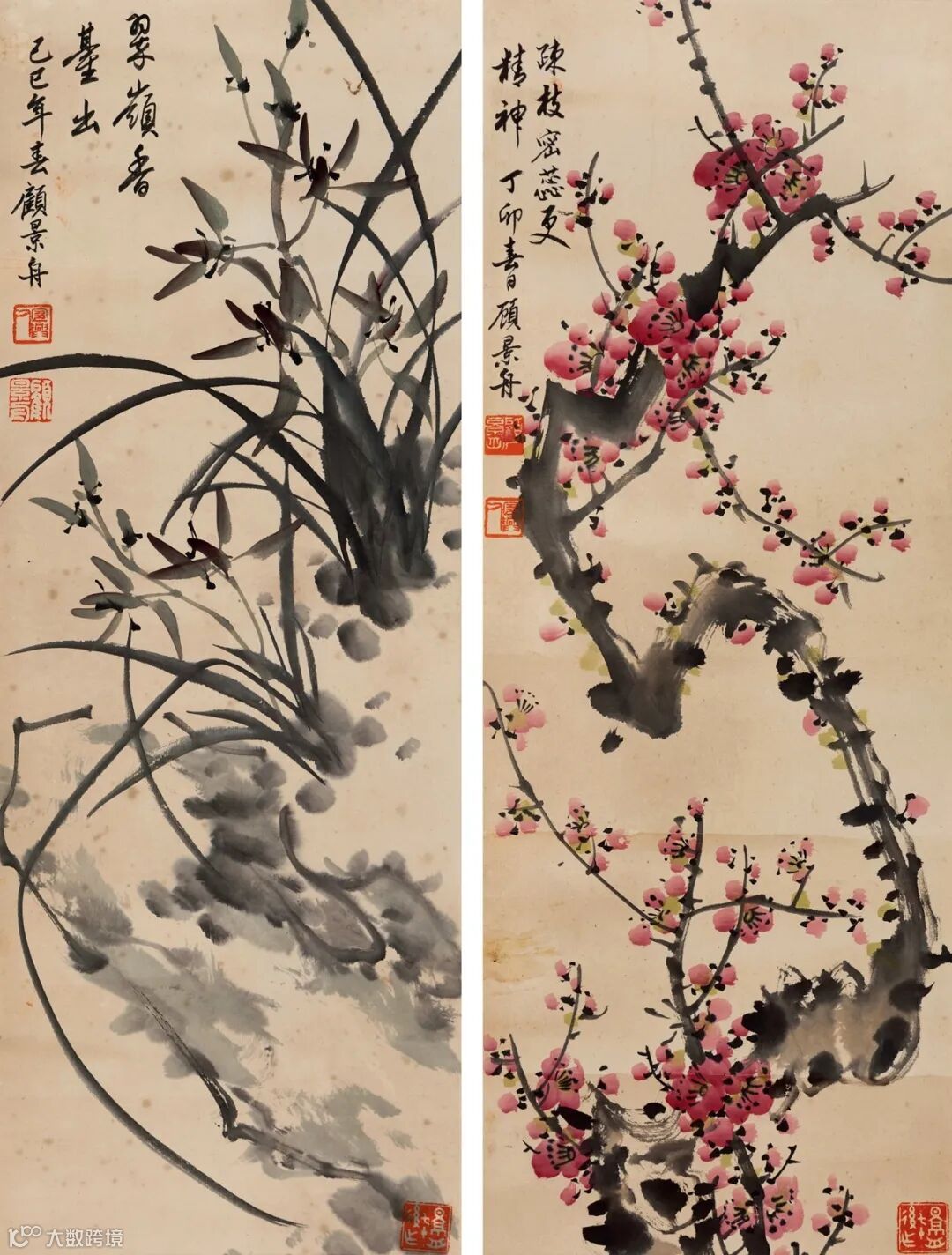 款识:1.翠岭香台出。己巳年春顾景舟。2.疏枝密蕊更精神。丁卯春月,顾景舟。