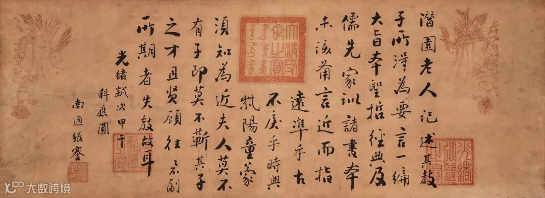 钤印:大清受命之宝(朱文)、张謇长寿(白文)、大清光绪殿选信印之宝(朱文)、光绪御览之宝(朱文)