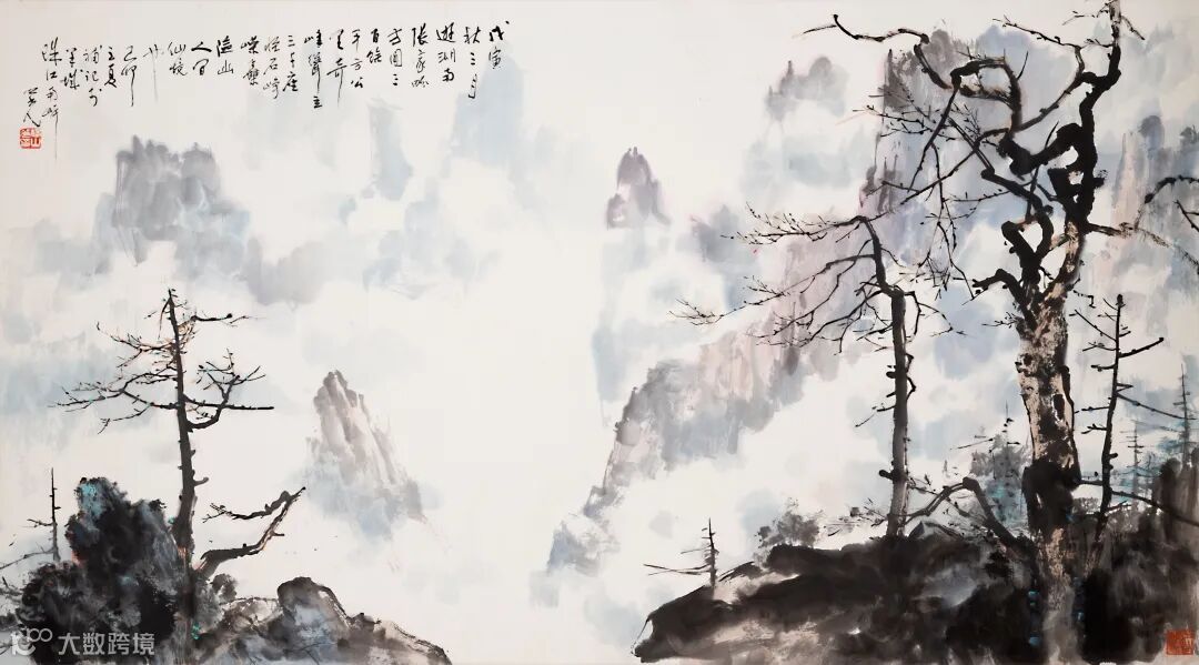 此井冈山图为野平兄杰构,摇笔云烟,格高韵致。应野平数画井冈山,最擅写貌,墨气淋漓,笔力酣畅,时称妙手。郑岗同志属题,杭人唐云于大石斋。