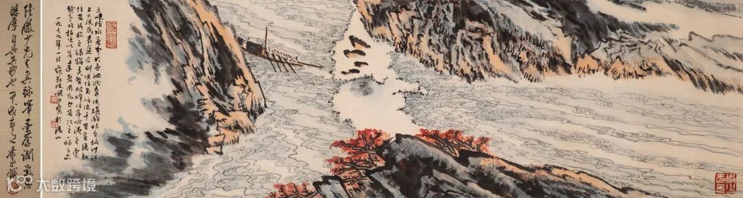 款识:三峡险水著闻于世,洄洑奔流,礁滩林立,故川江上下,视为畏途,今则俱往矣,恬波千里,岂復知往者,行旅之艰难夫,势破碎,性命俄顷之□哉,予故拈出以告来者,用为今昔比之一助云尔。一九七九年一月宛翁陆俨少写于汤山。