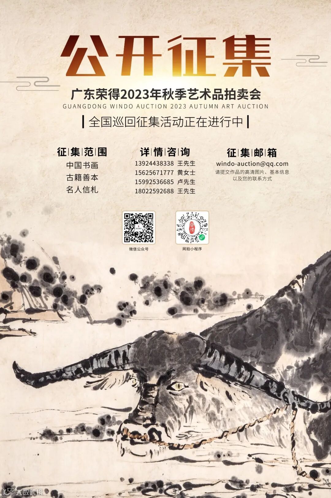 广东荣得2023年秋拍公开征集活动即日起已全面启动,接下来广东荣得征集团队将依次奔赴北京、南京、上海、西安、杭州、天津、郑州、合肥、成都、甘肃、广州、深圳等地开展全国巡回征集。