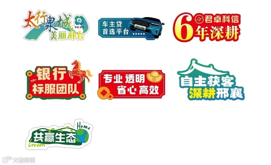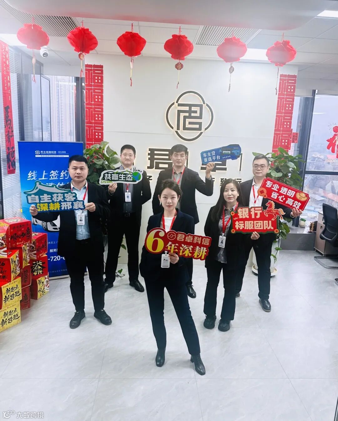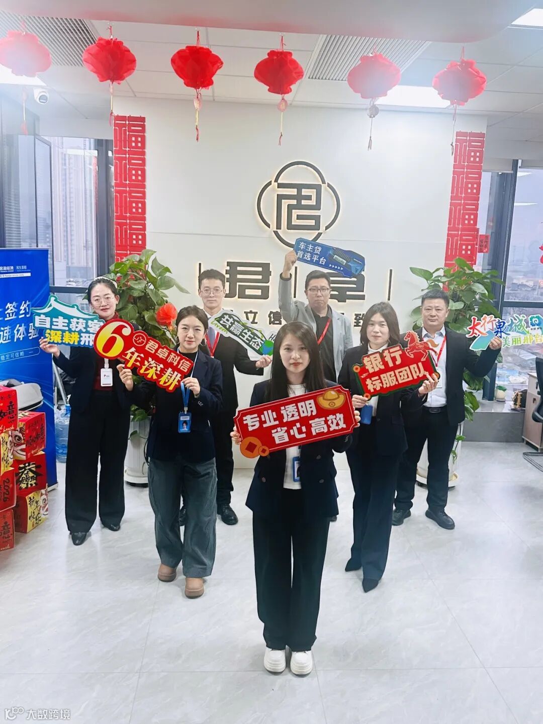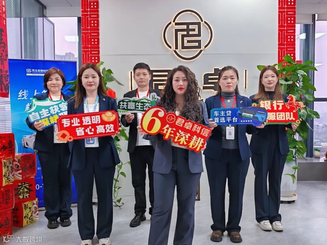 所有人手持关键词牌——六年深耕、车主贷首选平台、专业透明省心高效、银行标服团队、自主获客深耕邢襄、共赢生态。