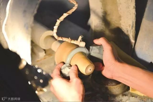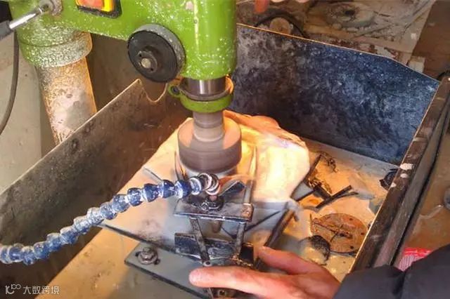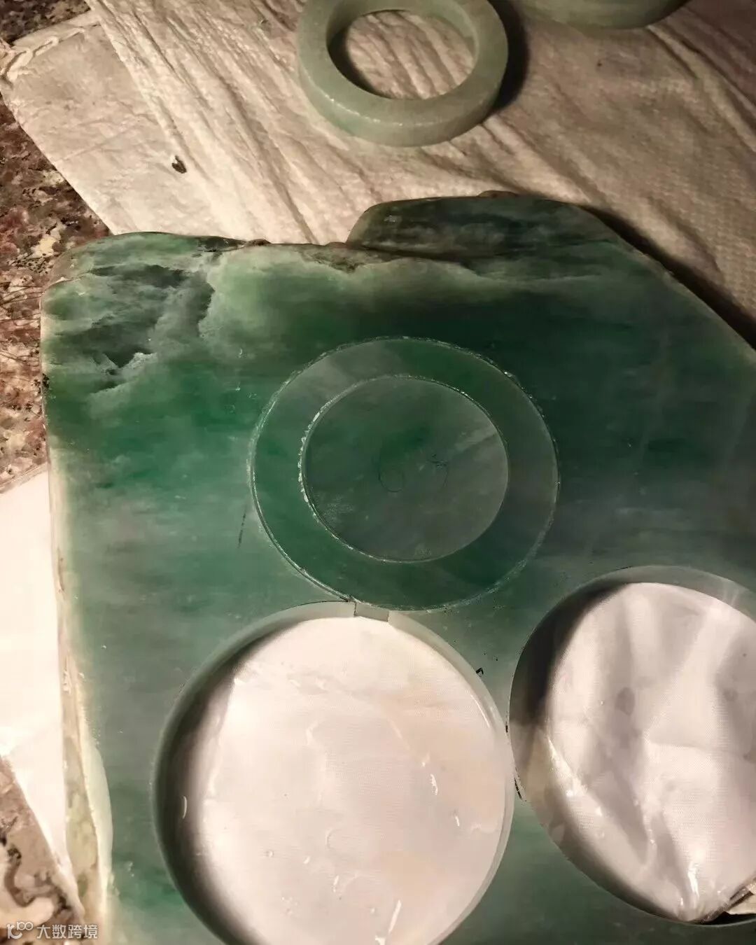 将画好手镯位的玉石根据外圈直径配上相应的钻头,将整个手镯吸出来,行内称为“吸外胚”;根据手镯的内圈直径,选择钻头吸出内圈,行内称为“吸内胚”。