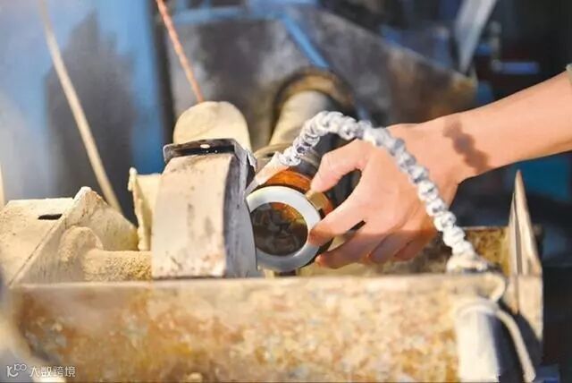 将粗胚的瑕疵、绺裂去除称为打顶;将手镯的棱角去掉,磨成平滑的状称为拍边。圆条手镯和扁条手镯的弧度不同,所以冲胚时候的角度和力度也不一样。
