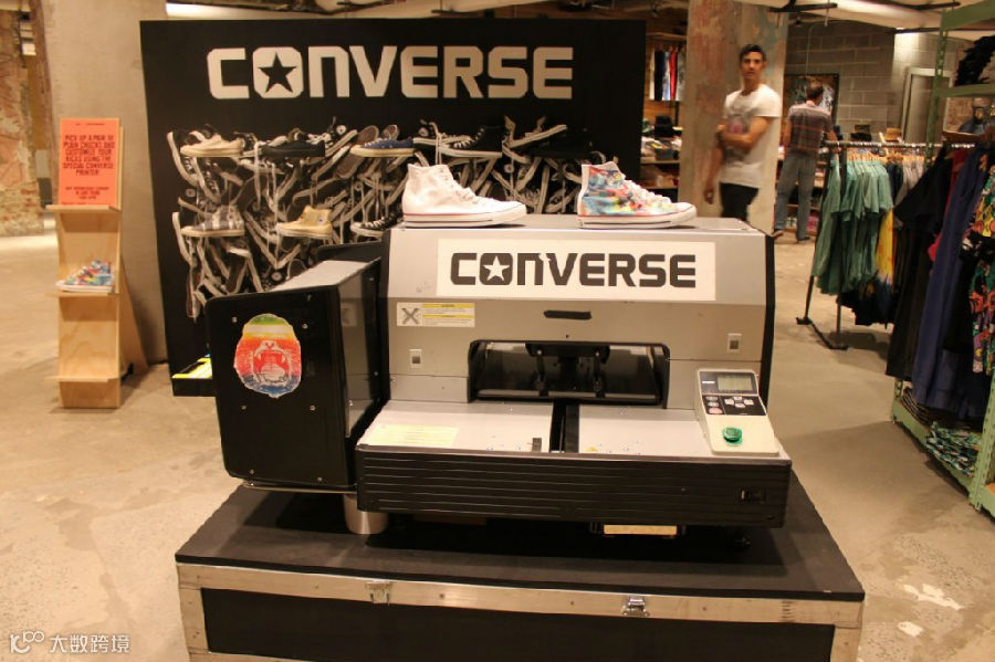 男装区试衣间外的这台机器,可以在Converse 球鞋上打印颜色。