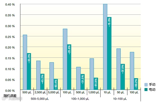 下图是手工和电动移液器随机误差的统计,可以看出电动移液器的误差小了不少。