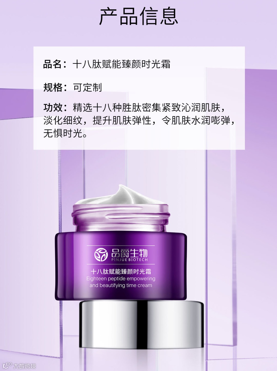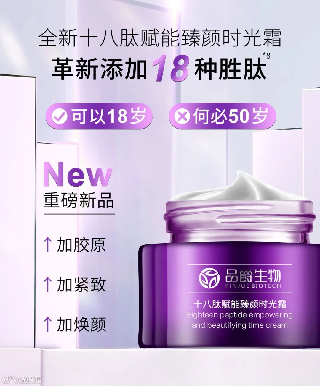 品爵最新研发新品十八肽赋能臻颜时光霜,精选18种胜肽复配双专利胶原,搭乘多种天然植萃,改善【垮】脸,让肌肤重新嘭弹!淡化脸部静态纹、动态纹,做脸部的吸“纹”器!