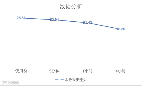 结论:水分经皮流失数值越小,表示皮肤水分流失越慢,在使用完产品后一小时,水分流失速度变慢,表明该产品具有优异的锁水效果。