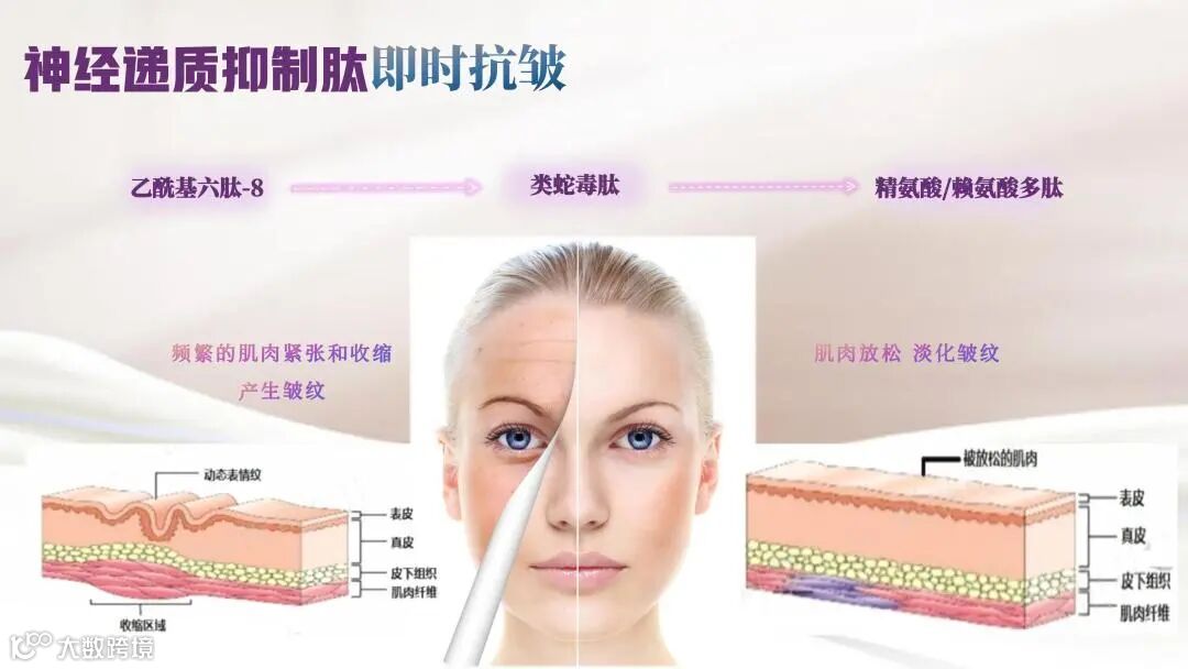 乙酰基六肽-8:经典抗皱肽,分子量小,透皮性强,抗皱活性高,为目前抗皱大热成分