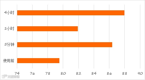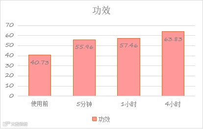 结论:使用产品前皮肤水分为40.73,刚用水分含量提升到55.96,说明有即时保湿效果;并且4小时后没有下降,说明产品具有优异的锁水和持久的保湿效果。