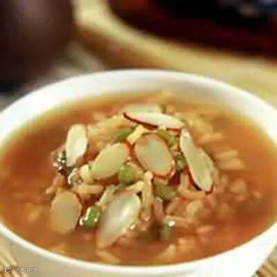 原料:大杏仁片10克,粳米50克,绿豆20克,糖3茶匙,水6杯。