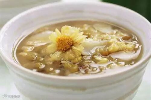 原料:绿豆150g、百合30g、菊花10g(用普通的干杭菊即可)、冰糖。