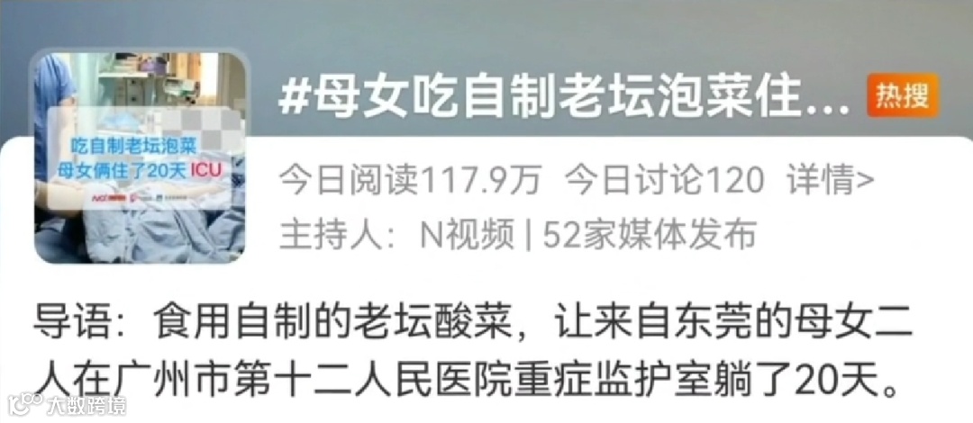 吃完当晚,两人出现恶心、呕吐、四肢乏力、胸闷气促等症状,进入当地医院ICU抢救。经当地疾控中心检验,她们的呕吐物及自制泡菜坛中检出“肉毒杆菌”,而中毒元凶则是肉毒毒素。