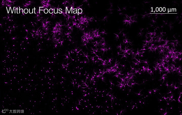 此外, Focus Map也可以很好地矫正由玻片缺陷带来的拼图问题。下图为大鼠海马神经元细胞的成像结果对比图。