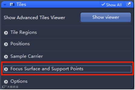 相信大家经常会用LSM 900/980(点击查看)做拼图或者多区域成像。不知道大家有没有留意过我们的Tiles工具栏中的“Focus Surface and Support Points”这个功能选项。