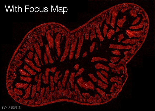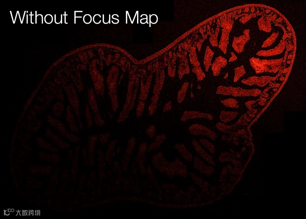 可以看到,在使用常规拍摄方式的时候,由于制片或者样品材料本身有一些缺陷,不同位置的焦面高度不一致,导致不能完全捕获到小鼠肠道切片的全部荧光信号。而Focus Map很好的解决了此类问题,得到的结果信息完整。所以如果在拼图的时候遇到此类问题,不妨试试Focus Map的功能。