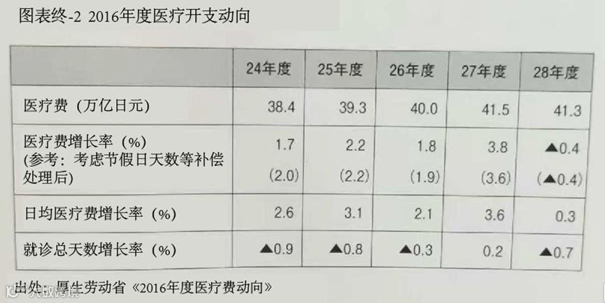 厚生劳动省每个月都会根据医疗机构呈报上来的医保费结算申请,对医保公费负担部分的费用进行统计,然后以《最新医保开支动向》的形式予以发布,而每年秋季会公布上一年度全年的统计结果。2017年9月15日发布的《平成28年度(2016年度)医保开支动向》显示,同年度的医保开支高达41.3万亿日元。这一数字虽较上一年度略微下降了约0.2万亿日元,但仍然连续三年突破了40万亿日元大关,很难说医保开支的增长趋势得到了控制。