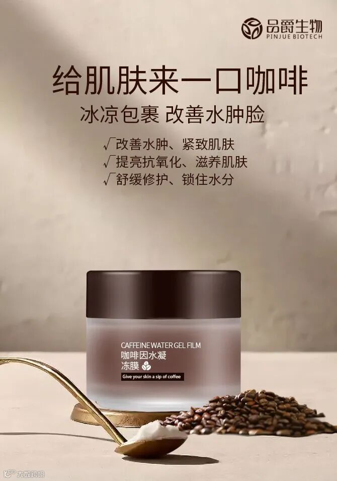 冰冰凉凉凝冻质地,咖啡因精华,复配多种营养精粹,镇静肌肤,改善水肿脸,消除面部浮肿,增强皮肤韧性,淡化细纹,紧致肌肤,改善皮肤色素沉着,提升肌肤含水量,帮助肌肤自我保水力,提高肌肤水润度。