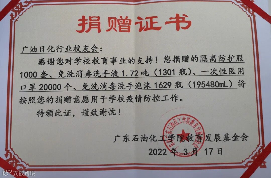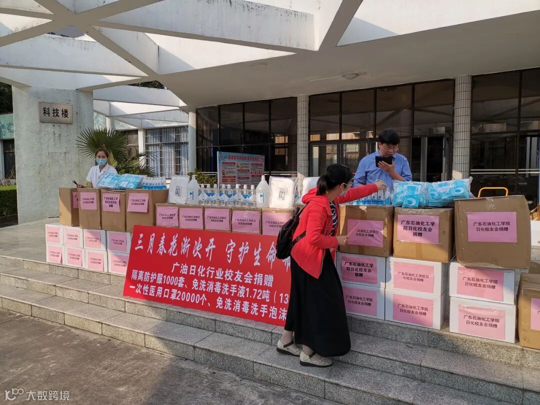 市白云莱茵化妆品厂总经理刘国雄以广油日化行业校友会的名义向母校捐赠隔离防护服1000套、免洗消毒洗手液1.72吨(1301瓶)、一次性医用口罩20000个、免洗消毒洗手泡沫1629瓶(195480ml)。助力母校做好疫情防控工作。
