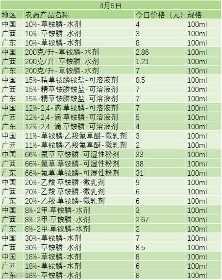 📊 4 月 5 日草铵膦系列产品零售价(100ml)