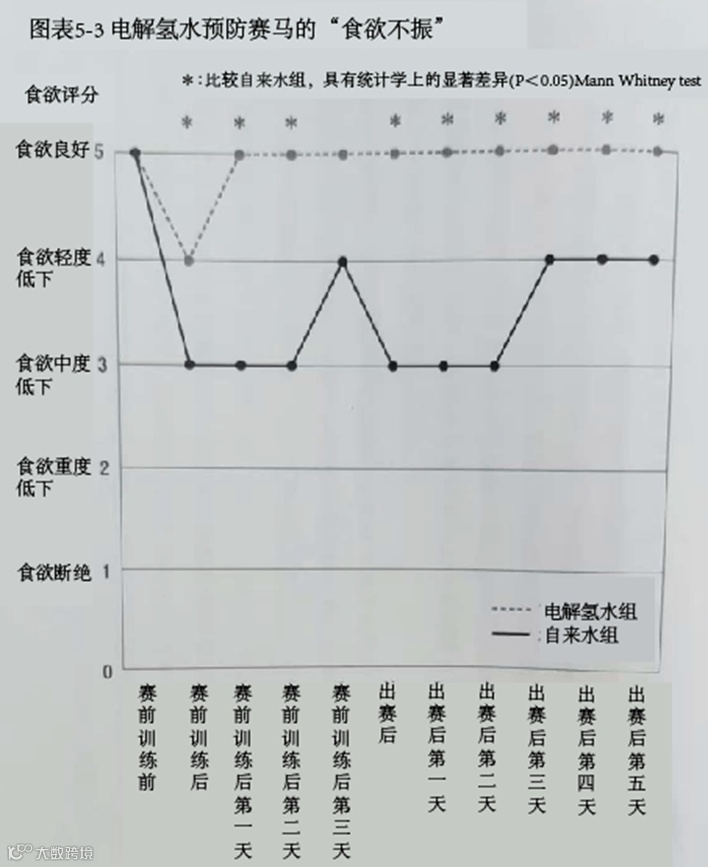 这次实验的测试对象全都是大井赛马场的现役赛马,共16匹,其中的9匹喝了1个月的电解氢水,剩下的7匹喝自来水。并且,在正式比赛3天前的最后一次赛前训练后以及正式比赛前后,对牠们的食欲状况进行了评分(图表5-3)。