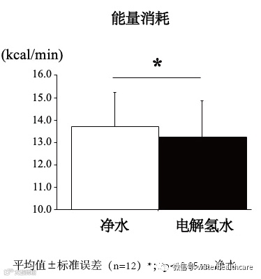 无论补充哪一种水,受试者运动后的体重都出现明显下降,(p<0.01),且在下降幅度上未见明显的差别。在血浆量、血液pH、碳酸氢盐浓度的变化、渐增负荷式运动的持续时间等方面,两者之间也没有明显差别。但,运动中的能量消耗,补充电解氢水时却比净水时表现出明显的低值(p=0.04)图2。