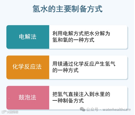 鼓泡法是一种直接向水中注入氢气的方法,化学反应法是一种使水与镁反应产生氢气的方法,电解法则是通过电解水将其分为氢和氧的一种方法。