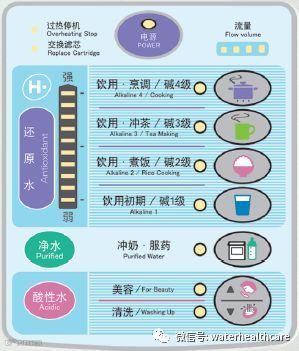 从面板上面可直观地看到制水种类和强弱档位、每分钟流量大小、过热保护停机、滤芯寿命到期提示等,还有在制取还原水或水素水时LED灯对应所选档位同步动态提示。