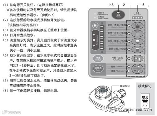 (九)LED灯上下闪动提示还原水制水。LED灯闪动高度与对应的还原水档位按键高度一致,越高表示越强,越低则越弱。在LED上下闪动提示制造还原水的强度的同时,主机也会自动播放音乐。因为净水档是无声状态,也无LED闪动提示。而制造酸性水时,则会发出“滴滴,滴滴,,”的提示声,以区别于还原水。