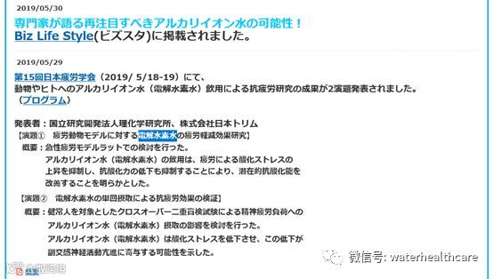 日前,日本碱性离子整水器协会更新了主页,在更新的新闻条目中发现两条,一条是“专家讲述应该再度引起重视的碱性离子水的可能性!”给出了原文链接,但因为笔者无法登录该国外网站查阅,详细讲了什么内容无法加以确认。第二条则是关于在上月中旬举办的第15届日本多宁疲劳学会上所发表的两篇演讲,该研究是日本多宁国立研究开发法人“理化学研究所”与株式会社日本多宁合作研究项目的发现成果,题目分别是“对疲劳动物模型的电解水素水减轻疲劳作用的研究”和“单次摄取电解水素水的抗疲劳作用的研究”。