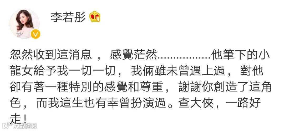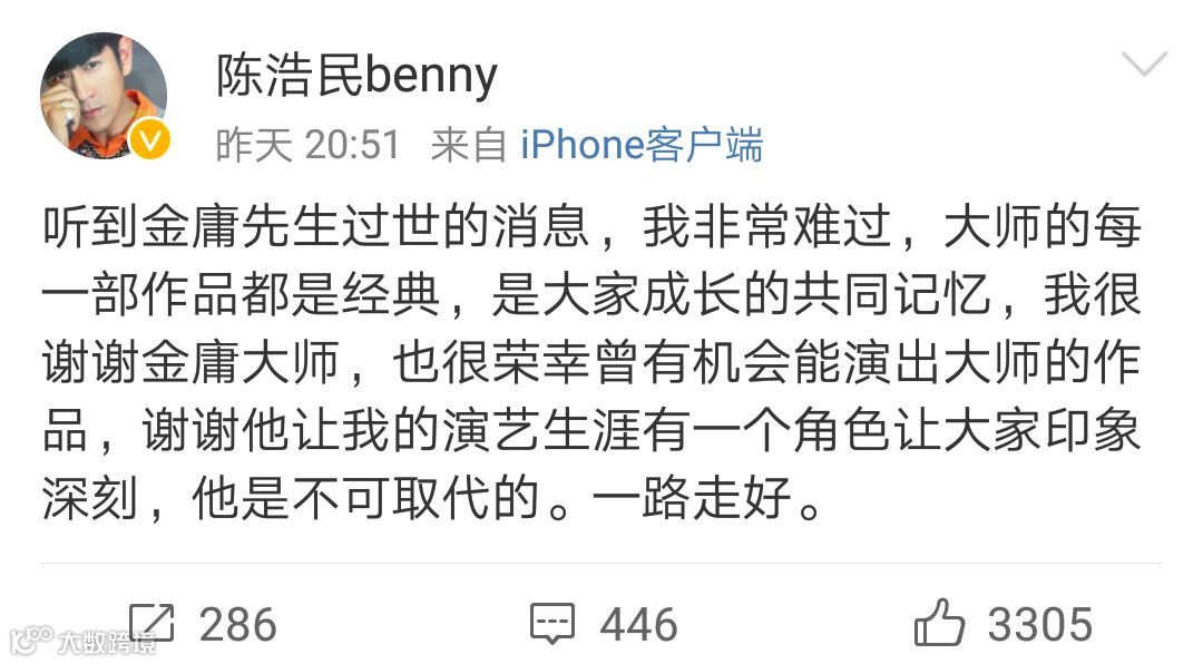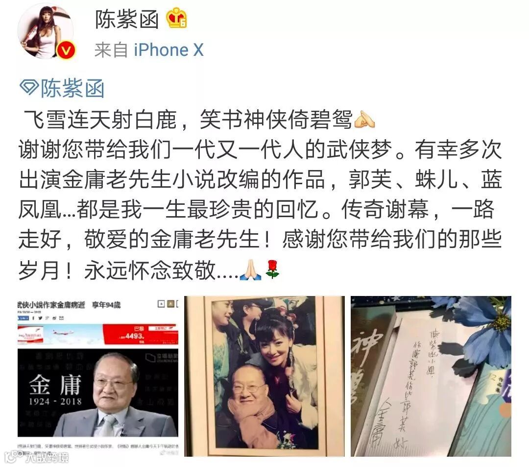 金庸先生去世后,出演过其笔下人物的演员纷纷发文悼念,包括李若彤(饰演过小龙女和王语嫣)、邓超(饰演过张无忌)、苏有朋(饰演过张无忌)、贾静雯(饰演过赵敏)、胡军(饰演过乔峰)、陈妍希(饰演过小龙女)、胡歌(饰演过郭靖)、袁弘、刘诗诗、蒋勤勤等近半百演员第一时间在微博送别金庸先生,每人的言语中都透露出满满的悲伤。
