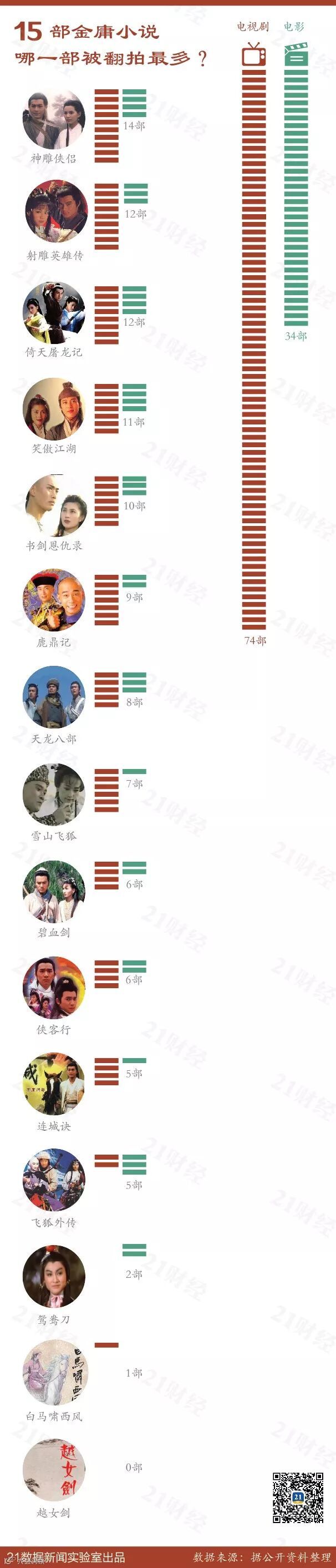毕竟,金庸先生的武侠江湖的剧集和电影非常多。据21数据新闻实验室统计,金庸小说一共被翻拍成了108部影视作品,包括74部电视剧,34部电影。其中“射雕三部曲”系列被翻拍最多,《神雕侠侣》有14个不同版本,《射雕英雄传》和《倚天屠龙记》亦有12个版本。