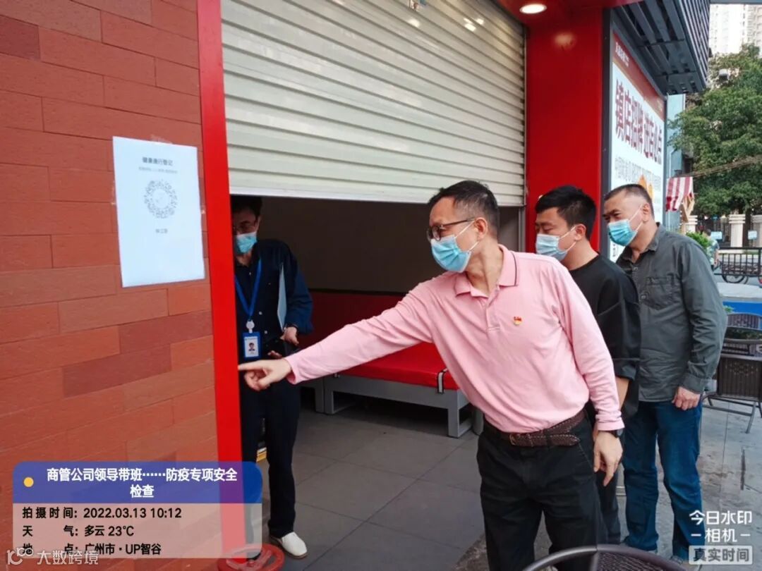 3月13日上午,珠江商管由党总支书记、董事长王友华带队,对公司经营的150万平方米物业进行拉网式全面防疫风险排查,排查物业租户1854家。排查以“线上+线下”方式开展,线上对接物业现场,展示重点区域防控现况;线下由公司领导班子成员带队抽查经营物业,现场排查现场整改。