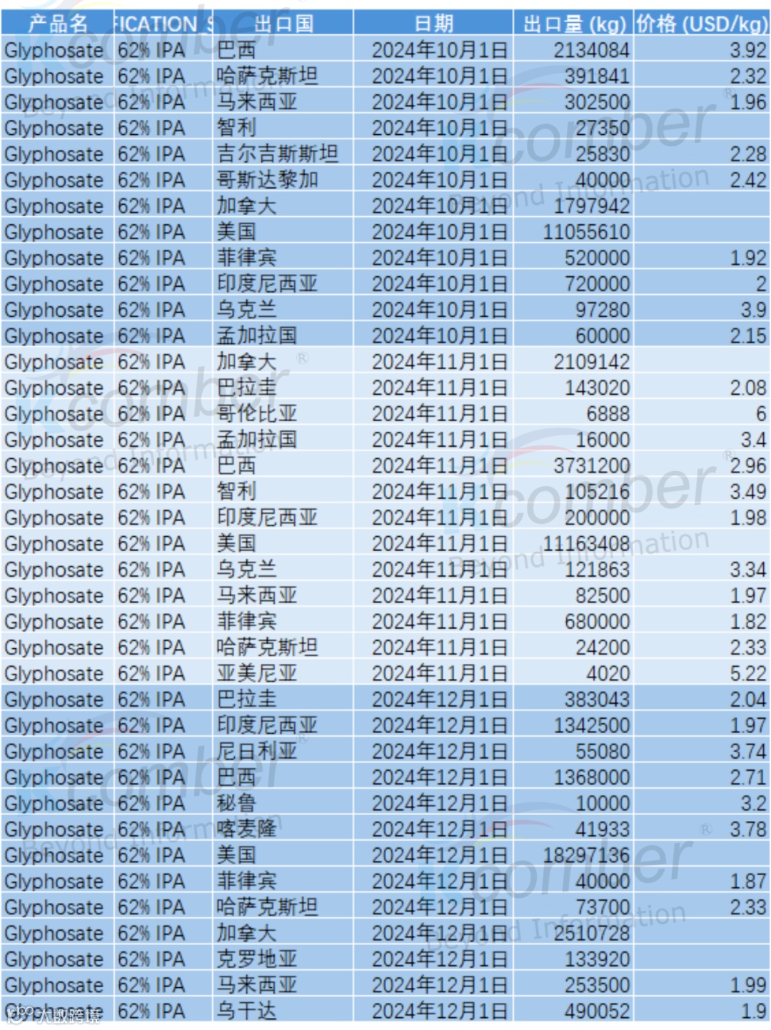2024年第四季度草甘膦 62% IPA 的出口——美国持续放量、巴西高位回调、印尼与马来西亚稳价补货,不同区域拼出一张全球需求地图。