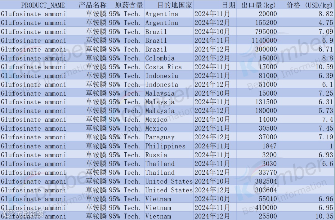 2024 年四季度草铵膦原药出口呈现 “前期集中放量、后期量价分化” 的结构特征,主流市场以规模消化为主,价格承压迹象明显。