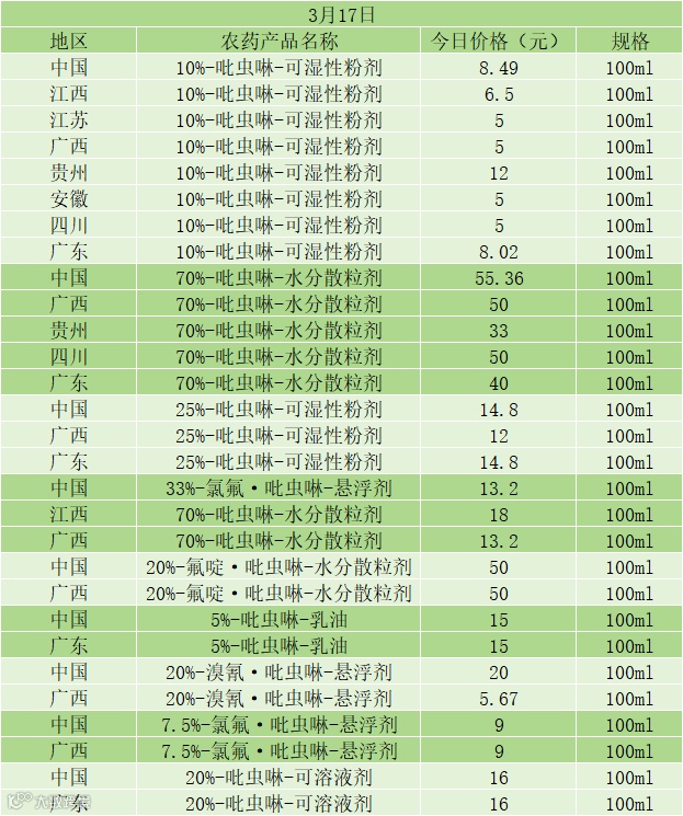 📅 3 月 17 日吡虫啉系列产品零售价(100ml)