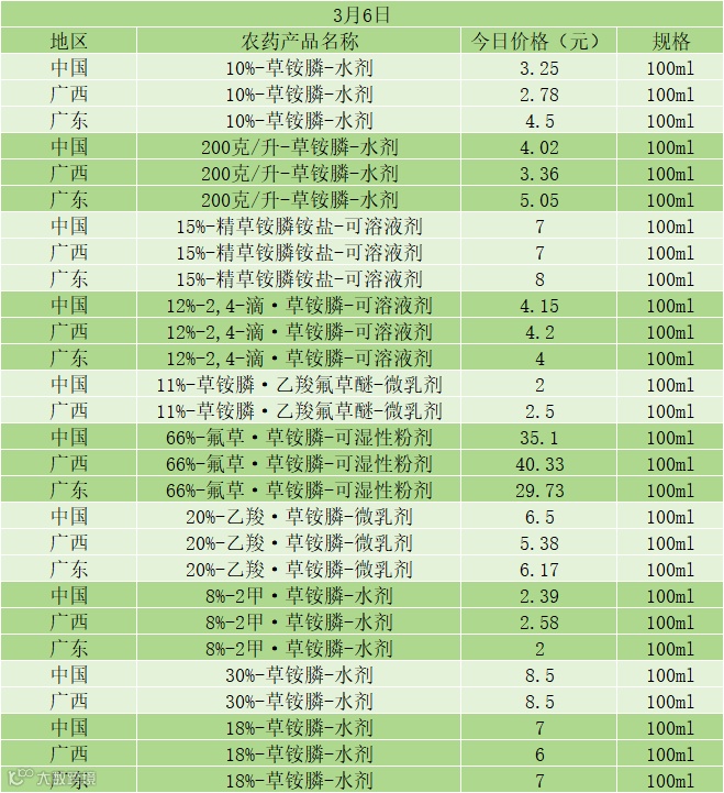10%- 草铵膦 - 水剂:中国 3.25 元、广西 2.78 元、广东 4.5 元