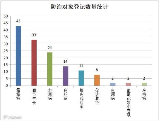 在防治对象方面,登记数量最多的是针对霜霉病的产品,达43个;其次是植物生长调节类产品和防治灰霉病的产品(详见下图)。这一分布客观反映了当前葡萄生产中的主要病虫害防控需求,也为种植者科学选药提供了重要参考。