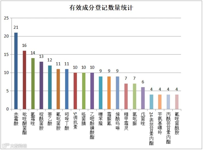 从有效成分来看,登记数量最多的是赤霉酸类产品(含不同种类)共计21个,吡唑醚菌酯、氰霜唑、啶酰菌胺、萘乙酸、氟吡菌胺、吲哚丁酸等成分也位居前列。统计显示,近三年葡萄用药共涉及60种有效成分,展现了较为丰富的技术储备。