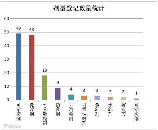在产品剂型方面,新登记产品呈现出多样化特点,涵盖10种不同剂型。其中可溶液剂以49个登记数量位居榜首,悬浮剂紧随其后,水分散粒剂以18个登记数量位列第三,其他剂型登记数量均不足10个(详见下图)。这一分布特征充分反映了当前葡萄用药对使用便捷性和施用效果的追求。