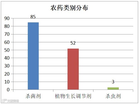 根据中国农药信息网最新统计数据显示,近三年葡萄用农药登记产品数量达139个,其中单剂38个,混剂101个。从产品类型来看,杀菌剂新增登记数量遥遥领先,共计85个,占新增总量的61.2%;植物生长调节剂次之;值得注意的是,除草剂在葡萄用药领域未有新增登记。