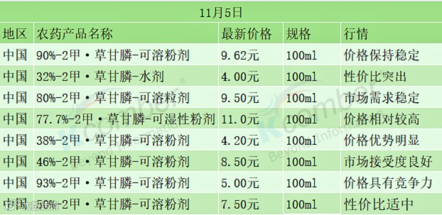从当前价格体系来看,不同含量、不同剂型的草甘膦产品价格差异明显。77.7%可湿性粉剂价格最高,达到11元/100ml;而32%水剂价格最低,仅4元/100ml。高含量产品中,93%可溶粉剂价格优势显著,仅售5元/100ml,性价比突出。